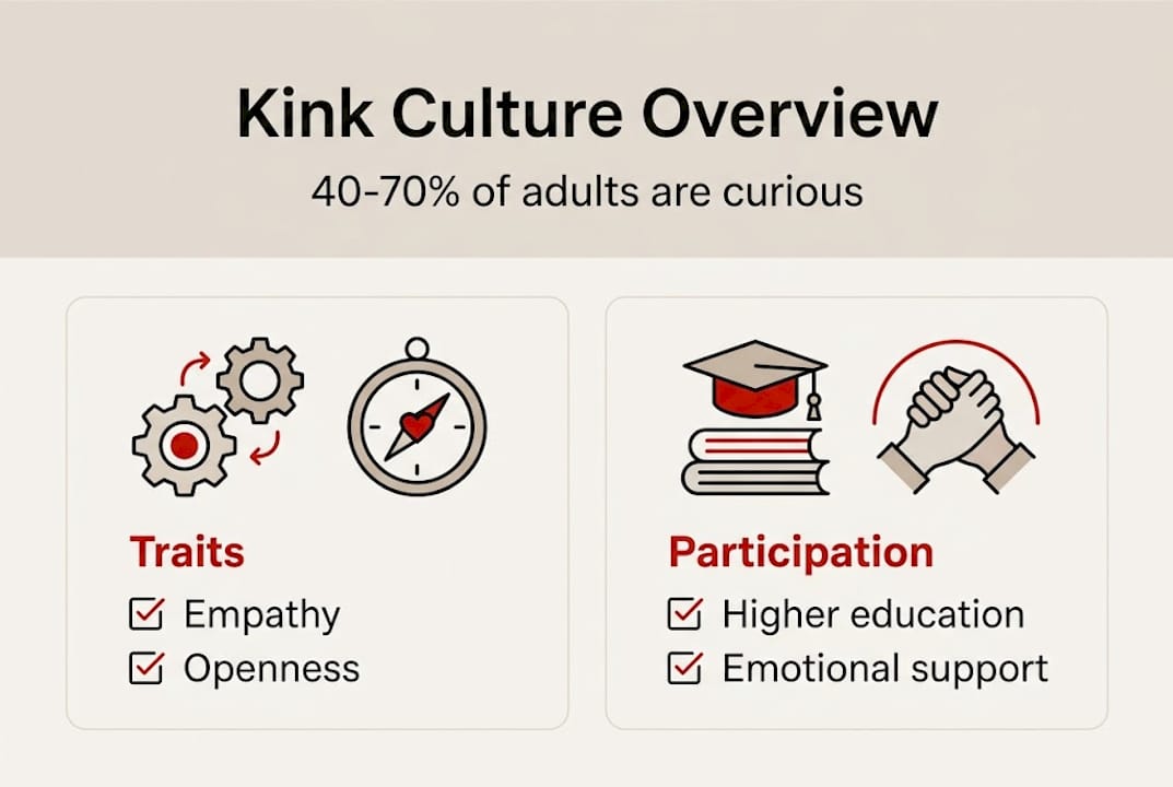 Most people assume kink is a niche thing. A dark corner of the internet, maybe. Something for "those people" who are into something weird. But here's the reality: 40-70% of adults report having kink or BDSM fantasies, and around 20% have actually acted on them. That's not a fringe group. That's your coworkers, your neighbors, maybe you. Kink culture is more layered, more psychologically rich, and more community-driven than most people realize. This guide breaks it all down: what kink culture actually is, what the research says about its benefits, how safety and consent work, and how to find your footing if you're curious.